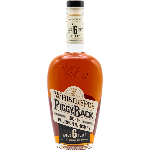 WhistlePig Piggyback 100 Proof Bourbon is a high corn mash bill bourbon for the truest expression of Bourbon Whiskey, aged 6 years to perfection. A nose of caramel corn partnered with oak notes, a palate of maple and vanilla with a creamy mouth feel and